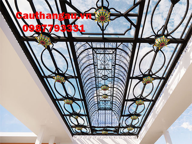 Kết cấu của dòng mái hiên sắt mỹ thuật này khá giống với kiểu mái có khung kính thẳng. Nhưng khác biệt lớn nhất của nó là có thêm sợi cáp treo giúp hỗ trợ khung sắt của công trình có được khả năng chịu lực tốt hơn. Đây cũng là lựa chọn phổ biến cho các vị trí thường xuyên có gió lớn. Tính an toàn cũng thờ thiết kế cáp treo mà được nâng cao không ít.